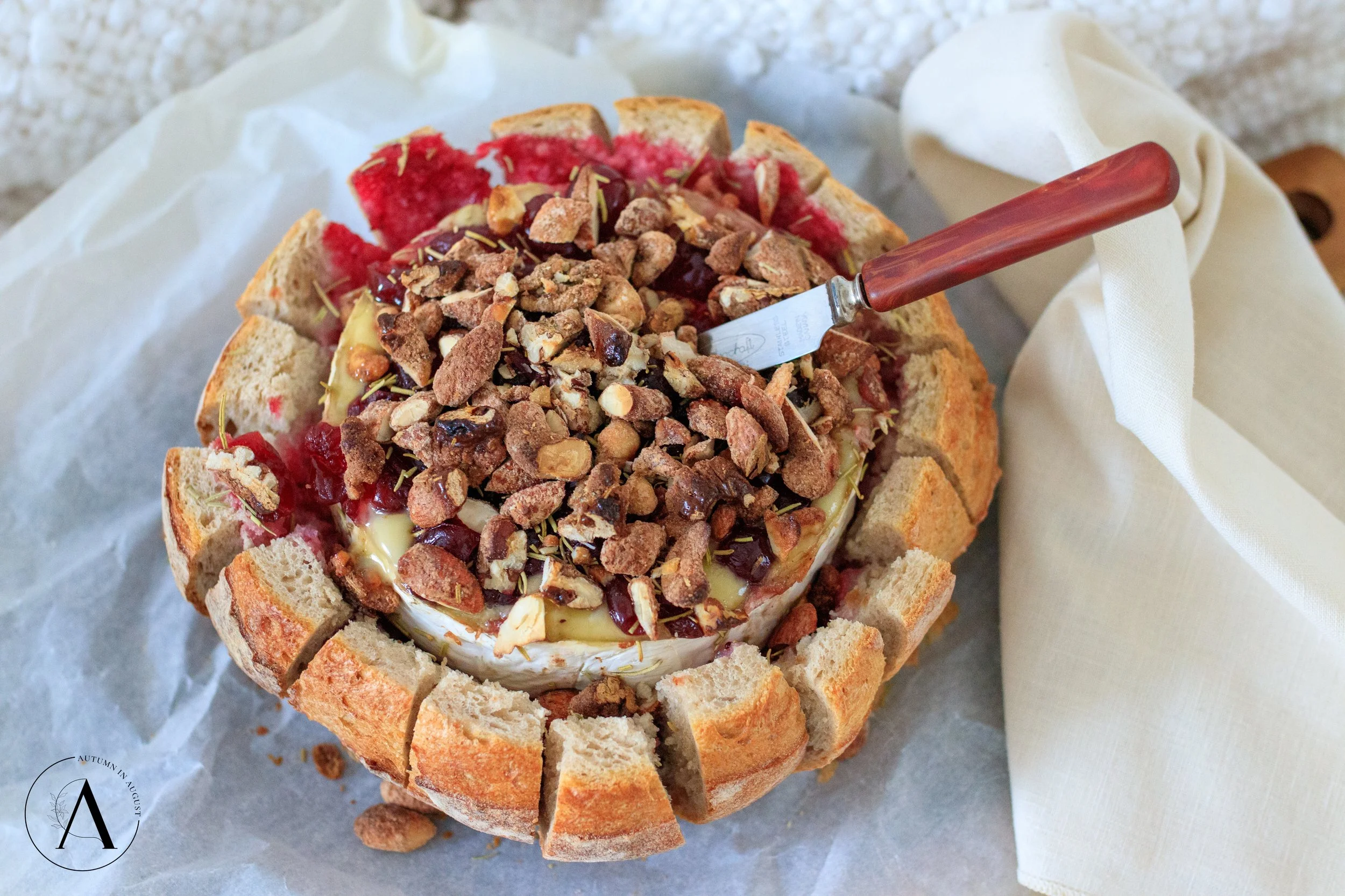 Press the wheel of brie, cut side up, into the loaf, on top of the cranberry sauce.